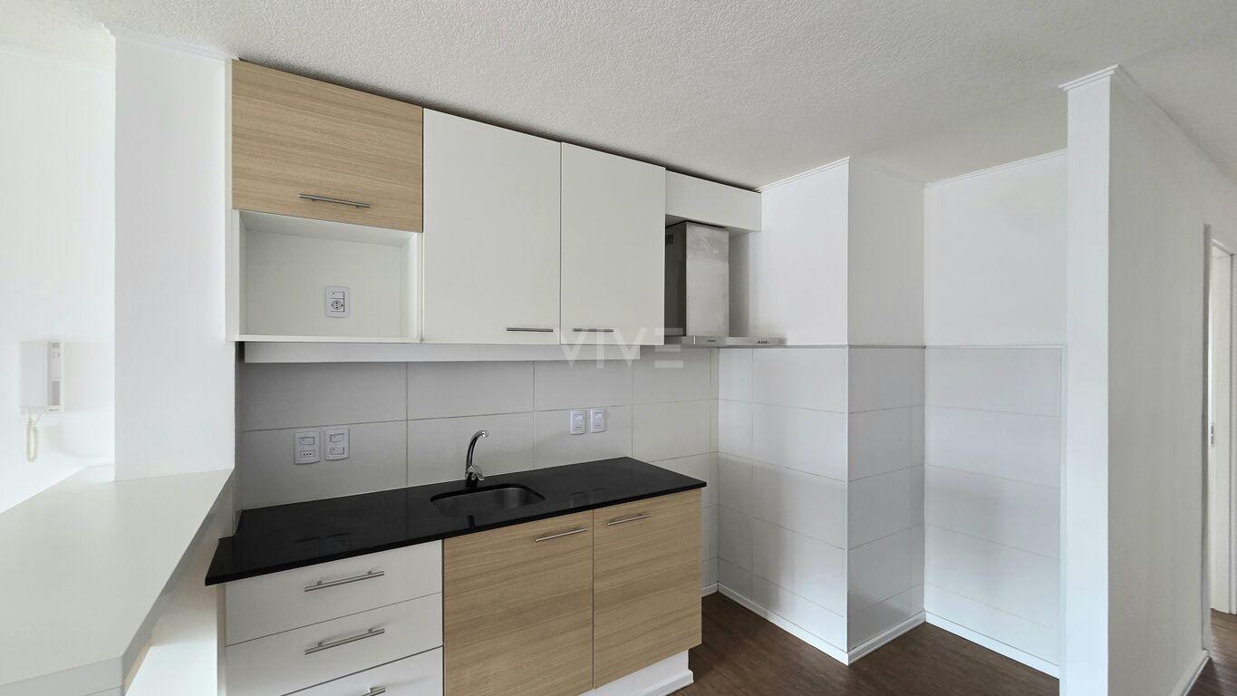 Cocina integrada con placares bajo mesada y aéreo, barra desayunadora y campana de extracción.