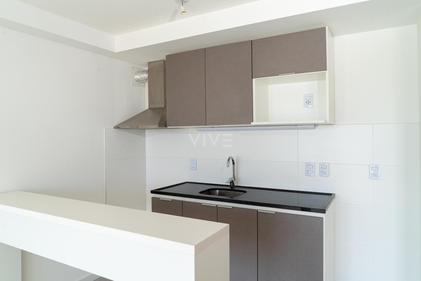 Cocina integrada con placares bajo mesada y aéreos, barra desayunadora y campana de extracción.