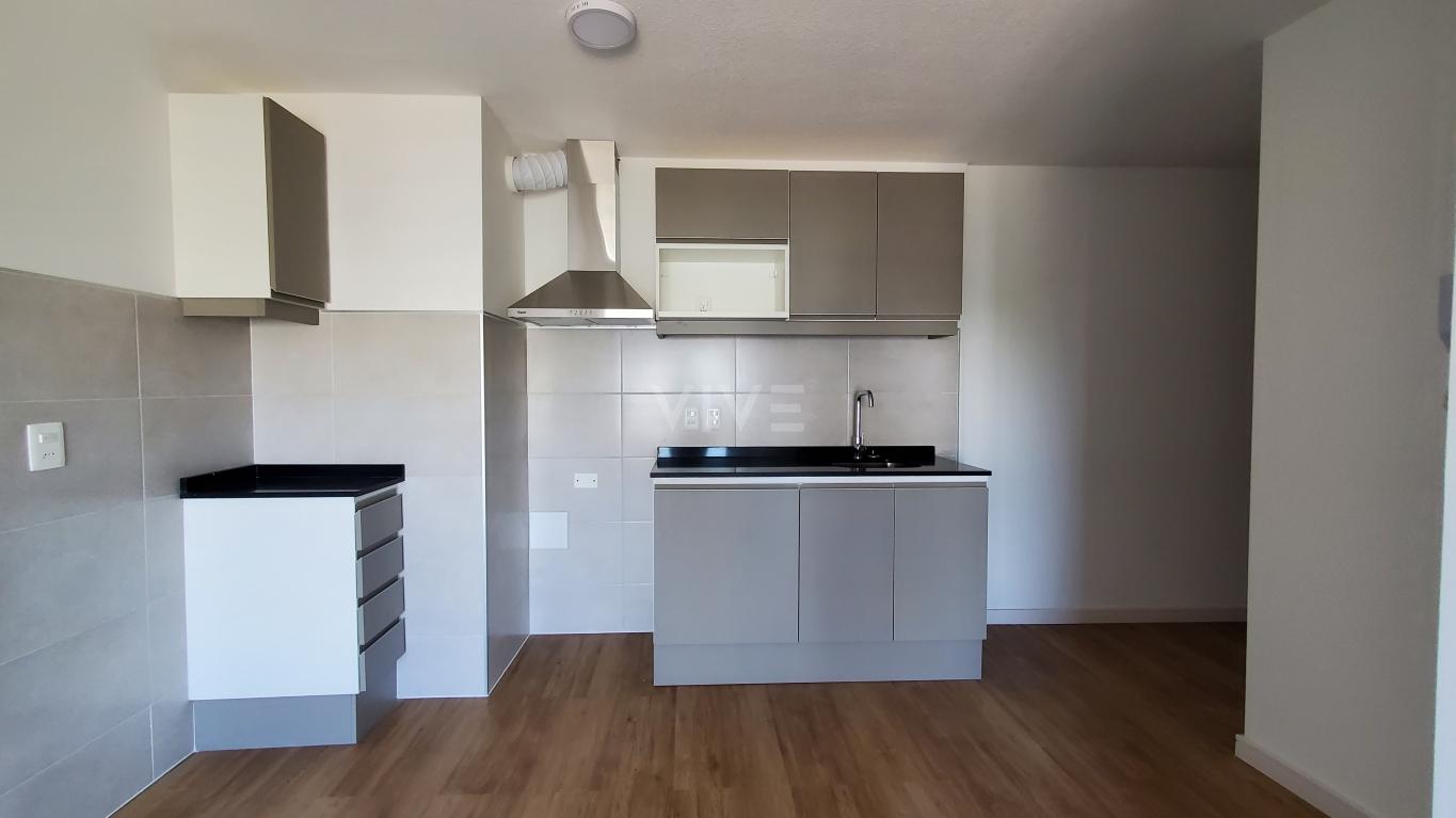 Cocina integrada con aire acondicionado, muebles bajo mesada y aéreo y campana de extracción.
